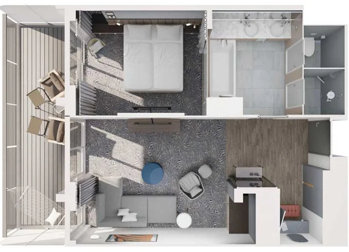 | JKBO - Junior Suite s balkónom B 26 m² + balkón 7 m² so stoličkami a podnožkami. 8-12. paluba. Max 4 osoby. Výhody Junior Suite. | 4 956 € 1 239 € za osobu |