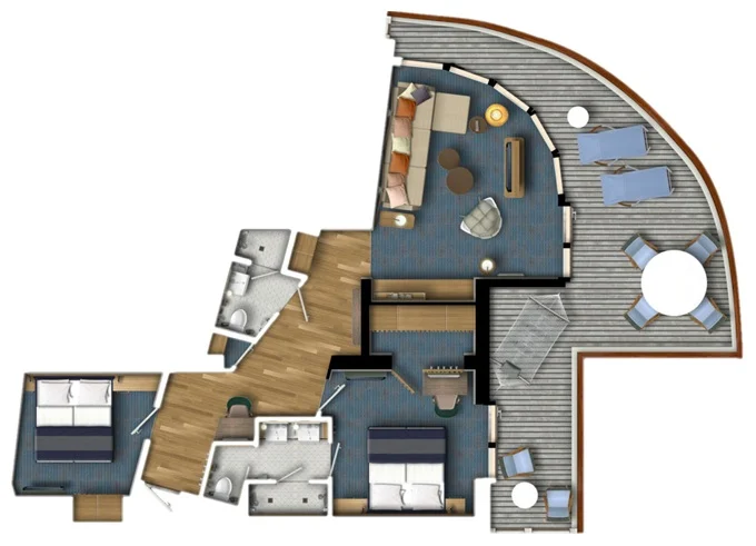 | SSAO - Schöne Aussicht Suite 39 m² + balkón 13-14 m² s ležadlami a hojdacou sieťou. 9-10. paluba. Max 4 osoby. Výhody Suite. | 20 396 € 5 099 € za osobu | ||