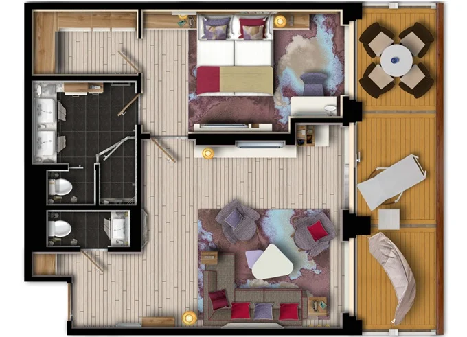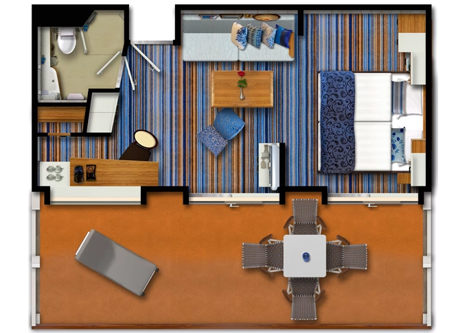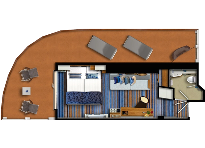 | SUTO - Themen Suite 54 m² + balkón 15 m² so stolom, ležadlom a hojdacou sieťou. Spálňa, obývacia časť, šatník. 10. paluba. Max 4 osoby. Výhody Suite. | 17 328 € 5 776 € za osobu | ||