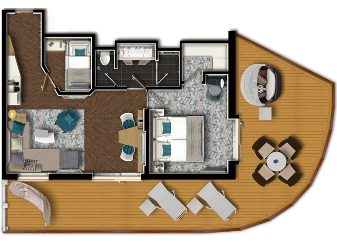 | SUDO - Diamant Suite 42 m² + balkón 47 m² so stolom, hojdacou sieťou, 2 ležadlami a posteľou Sun island. Spálňa (manželská posteľ), obývacia izba (rozkladacia pohovka), 2. spálňa (lôžko a vyklápacia posteľ), hracia konzola. 6. paluba. Max 6 osoby. Výhody Suite. | 16 856 € 16 856 € za osobu | ||
